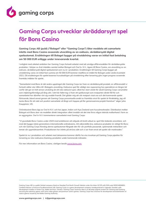 Gaming Corps AB (publ) (“Bolaget” eller “Gaming Corps”) låter meddela att samarbete inletts med Bons Casino avseende utveckling av en exklusiv, skräddarsydd digital spelautomat. Ersättningen till Bolaget bygger på vinstdelning varav en initial fast betalning om 50 000 EUR erläggs under innevarande kvartal.