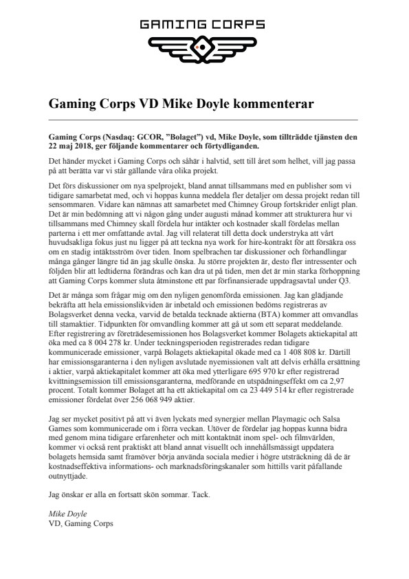 Gaming Corps (Nasdaq: GCOR, “Bolaget”) vd, Mike Doyle, som tillträdde tjänsten den 22 maj 2018, ger följande kommentarer och förtydliganden.