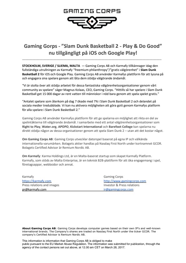 STOCKHOLM, SVERIGE / SLIEMA, MALTA  – Gaming Corps AB och Karmafy tillkännager idag den fullständiga utrullningen av Karmafy “freemium philanthropy”/”gratis välgörenhet” i Slam Dunk Basketball 2 för iOS och Google Play. Gaming Corps AB använder Karmafys plattform för att lyssna på och engagera sina spelare genom att låta dem stödja välgörande ändamål.