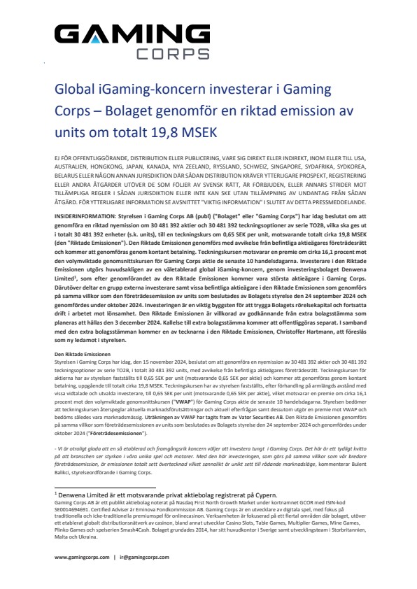 INSIDERINFORMATION: Styrelsen i Gaming Corps AB (publ) (“Bolaget” eller “Gaming Corps”) har idag beslutat om att genomföra en riktad nyemission om 30 481 392 aktier och 30 481 392 teckningsoptioner av serie TO2B, vilka ska ges ut i totalt 30 481 392 enheter (s.k. units), till en teckningskurs om 0,65 SEK per unit, motsvarande totalt cirka 19,8 MSEK (den “Riktade Emissionen”). Den Riktade Emissionen genomförs med avvikelse från befintliga aktieägares företrädesrätt och kommer att genomföras genom kontant betalning. Teckningskursen motsvarar en premie om cirka 16,1 procent mot den volymviktade genomsnittskursen för Gaming Corps aktie de senaste 10 handelsdagarna. Investerare i den Riktade Emissionen utgörs huvudsakligen av en väletablerad global iGaming-koncern, genom investeringsbolaget Denwena Limited[1], som efter genomförandet av den Riktade Emissionen kommer vara största aktieägare i Gaming Corps. Därutöver deltar en grupp externa investerare samt vissa befintliga aktieägare i den Riktade Emissionen som genomförs på samma villkor som den företrädesemission av units som beslutades av Bolagets styrelse den 24 september 2024 och genomfördes under oktober 2024. Investeringen är en viktig byggsten för att trygga Bolagets rörelsekapital och fortsatta drift i arbetet mot lönsamhet. Den Riktade Emissionen är villkorad av godkännande från extra bolagsstämma som planeras att hållas den 3 december 2024. Kallelse till extra bolagsstämma kommer att offentliggöras separat. I samband med den extra bolagsstämman kommer en av tecknarna i den Riktade Emissionen, Christoffer Hartmann, att föreslås som ny ledamot i styrelsen.