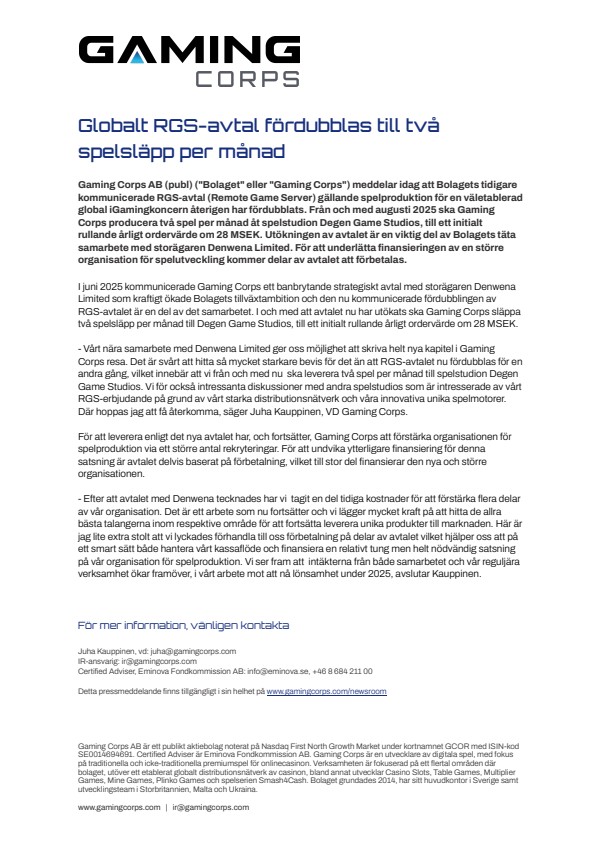 Gaming Corps AB (publ) (“Bolaget” eller “Gaming Corps”) meddelar idag att Bolagets tidigare kommunicerade RGS-avtal (Remote Game Server) gällande spelproduktion för en väletablerad global iGaming-koncern återigen har fördubblats. Från och med augusti 2025 ska Gaming Corps producera två spel per månad åt spelstudion Degen Game Studios, till ett initialt rullande årligt ordervärde om 28 MSEK. Utökningen av avtalet är en viktig del av Bolagets täta samarbete med storägaren Denwena Limited. För att underlätta finansieringen av en större organisation för spelutveckling kommer delar av avtalet att förbetalas.