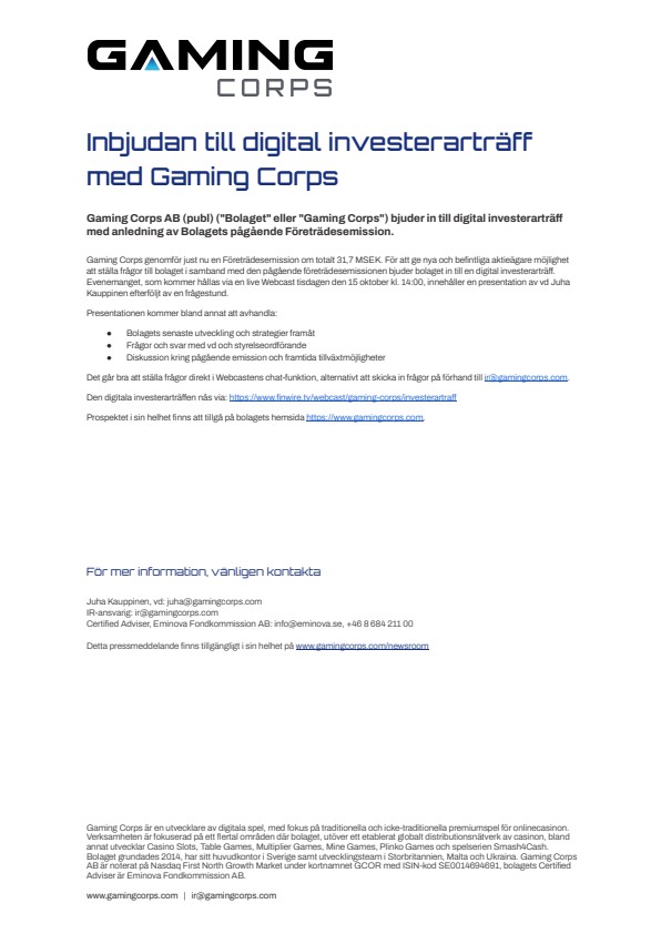 Gaming Corps genomför just nu en Företrädesemission om totalt 31,7 MSEK. För att ge nya och befintliga aktieägare möjlighet att ställa frågor till bolaget i samband med den pågående företrädesemissionen bjuder bolaget in till en digital investerarträff. Evenemanget, som kommer hållas via en live Webcast tisdagen den 15 oktober kl. 14:00, innehåller en presentation av vd Juha Kauppinen efterföljt av en frågestund.