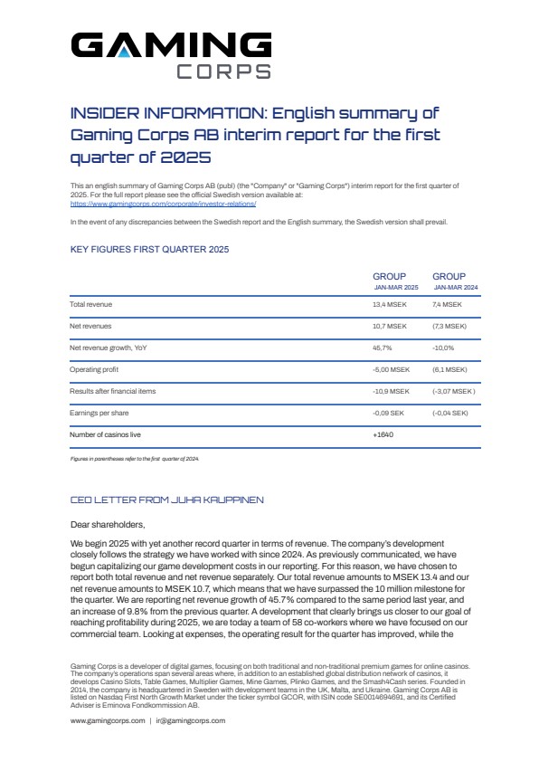 This an english summary of Gaming Corps AB (publ) (the “Company” or “Gaming Corps”) interim report for the first quarter of 2025.