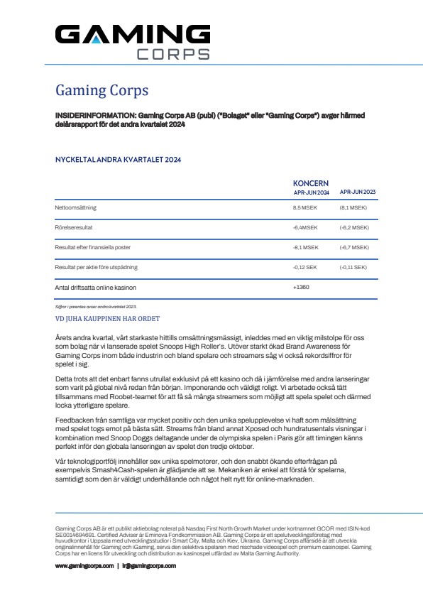 INSIDERINFORMATION: Gaming Corps AB (publ) (“Bolaget” eller “Gaming Corps”) avger härmed delårsrapport för det andra kvartalet 2024