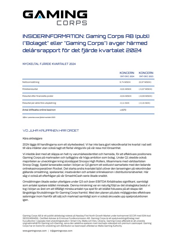Denna information är sådan information som Gaming Corps AB (publ) är skyldigt att offentliggöra enligt EU:s marknadsmissbruksförordning 596/2014. Informationen lämnades, genom ovanstående kontaktpersons försorg, för offentliggörande vid den tidpunkt som är angiven av Gaming Corps nyhetsdistributör MFN vid publiceringen av detta pressmeddelande.