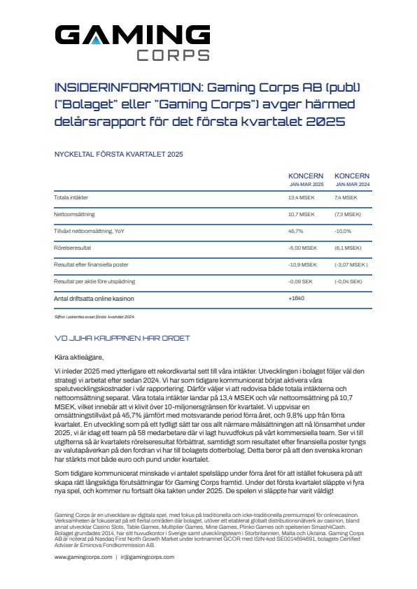 INSIDERINFORMATION: Gaming Corps AB (publ) (“Bolaget” eller “Gaming Corps”) avger härmed delårsrapport för det första kvartalet 2025