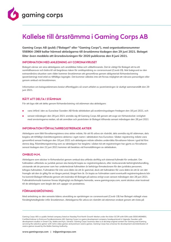 Gaming Corps AB (publ) (“Bolaget” eller “Gaming Corps”), med organisationsnummer 556964–2969, kallar härmed aktieägarna till årsstämma tisdagen den 29 juni 2021. Bolaget låter även meddela att årsredovisningen för 2020 publiceras den 8 juni 2021.