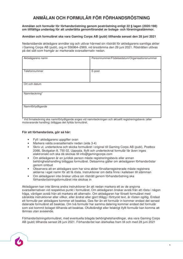 Det ifyllda formuläret måste vara Bolaget tillhanda senast måndagen den 28 juni 2021. Det ifyllda formuläret ska skickas till adress Gaming Corps AB (publ), Postbox 2066, Skolgatan 8, 750 02, Uppsala. Ifyllt formulär får även inges elektroniskt och ska då skickas till info@gamingcorps.com. Om aktieägaren förhandsröstar genom ombud ska fullmakt biläggas formuläret. Om aktieägaren är en juridisk person ska registreringsbevis eller annan behörighetshandling biläggas formuläret. Aktieägaren får inte förse förhandsrösten med särskilda instruktioner eller villkor. Om så sker är rösten (dvs. förhandsröstningen i dess helhet) ogiltig.