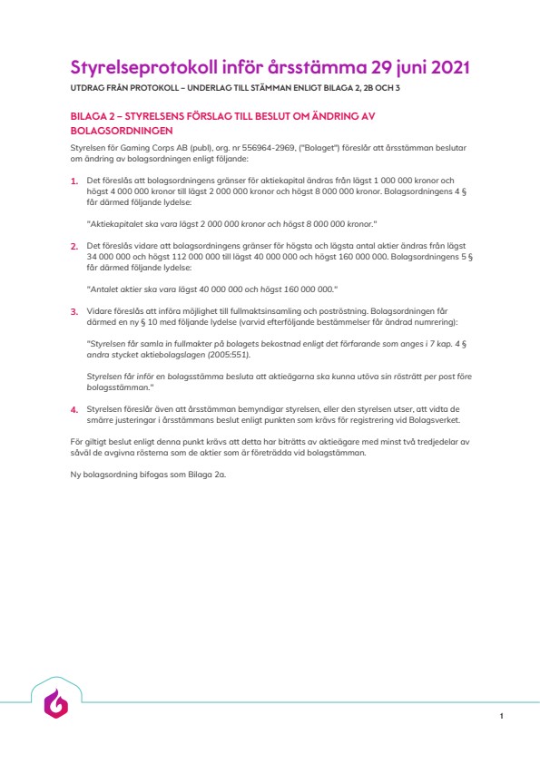 • Styrelseprotokoll inför årsstämma den 29 juni i Gaming Corps AB (Utdrag från protokoll – underlag till stämman enligt bilaga 2, 2b och 3)