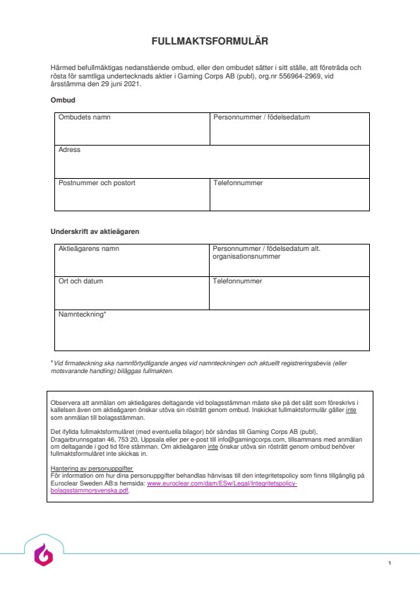 Aktieägare som skickar in förhandsröst genom ombud ska utfärda skriftlig och daterad fullmakt för ombudet. Om fullmakten utfärdats av juridisk person ska bestyrkt kopia av registreringsbevis, eller motsvarande behörighetshandling, utvisande att de personer som har undertecknat fullmakten är behöriga firmatecknare för den juridiska personen, bifogas fullmakten. Fullmakten får inte vara äldre än ett år gammal, dock att fullmakten får vara äldre än ett år om det framgår att den är giltig för en längre period, längst fem år. En kopia av fullmakten samt eventuellt registreringsbevis bör ha kommit Bolaget tillhanda genom att insändas till Bolaget på adress enligt ovan senast måndagen den 28 juni 2021. Fullmaktsformulär kommer finnas tillgängligt via Bolagets hemsida, www.gamingcorps.com, samt skickas utan kostnad till de aktieägare som begär det och uppger sin postadress.