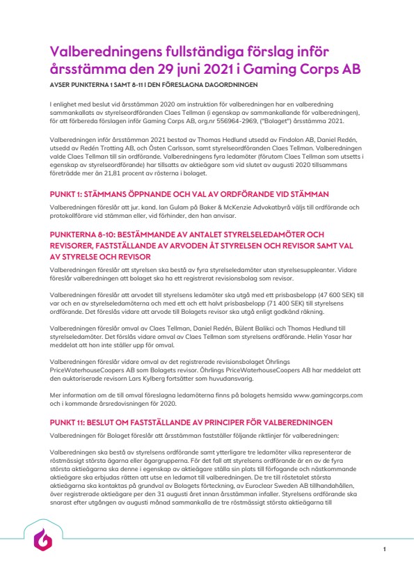 • Valberedningens fullständiga förslag inför årsstämma den 29 juni 2021 i Gaming Corps AB (punkterna 1 samt 8-11 på den föreslagna dagordningen)