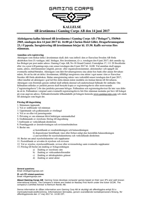 Årsredovisning, revisionsberättelse samt fullständiga förslag till beslut kommer att hållas tillgängliga hos bolaget senast två veckor före årsstämman. Handlingarna skickas till de aktieägare som begär det. Handlingarna kommer dessutom att publiceras på Bolagets webbplats, www.gamingcorps.com.