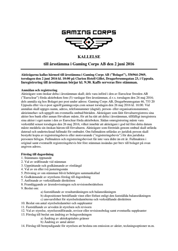 Aktieägare som önskar delta i årsstämman skall; dels vara införd i den av Euroclear Sweden AB (“Euroclear”) förda aktieboken fem (5) vardagar före årsstämman, d.v.s. torsdagen den 26 maj 2016; dels anmäla sig hos Bolaget per post under adress: Gaming Corps AB, Dragarbrunnsgatan 46, 753 20 Uppsala eller via e-post agm@gamingcorps.comsenast torsdagen den 26 maj 2016 kl. 16:00. Vid anmälan skall uppges namn, adress, telefonnummer (dagtid), person- eller organisationsnummer, aktieinnehav och uppgift om eventuella ombud/biträden. Aktieägare som låtit förvaltarregistrera sina aktier hos bank eller annan förvaltare måste, för att ha rätt att delta i årsstämman, tillfälligt inregistrera sina aktier i eget namn i den av Euroclear förda aktieboken. Sådan omregistrering måste vara verkställd senast torsdagen den 26 maj 2016, vilket innebär att aktieägare i god tid före detta datum måste meddela sin önskan härom till förvaltaren. Aktieägare som företräds genom ombud skall utfärda daterad och undertecknad fullmakt för ombudet. Om fullmakten utfärdas av juridisk person skall bestyrkt kopia av registreringsbevis eller motsvarande (“registreringsbevis”) för den juridiska personen bifogas. Fullmakten och registreringsbeviset får inte vara äldre än ett år. Fullmakten i original samt eventuellt registreringsbevis bör före stämman insändas per brev till bolaget på ovan angiven adress.
