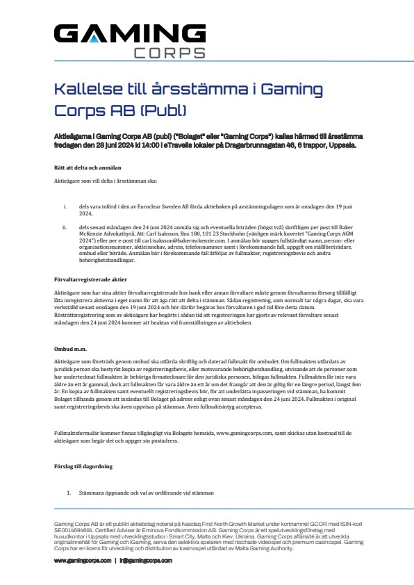 Aktieägarna i Gaming Corps AB (publ) (“Bolaget” eller “Gaming Corps”) kallas härmed till årsstämma fredagen den 28 juni 2024 kl 14:00 i eTravelis lokaler på Dragarbrunnsgatan 46, 6 trappor, Uppsala.