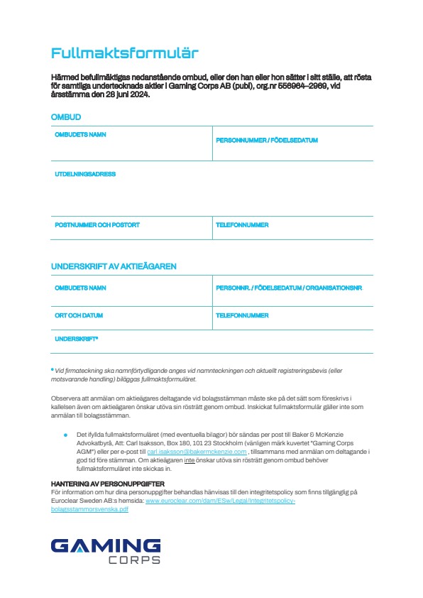 Fullmaktsformulär kommer finnas tillgängligt via Bolagets hemsida, www.gamingcorps.com, samt skickas utan kostnad till de aktieägare som begär det och uppger sin postadress.