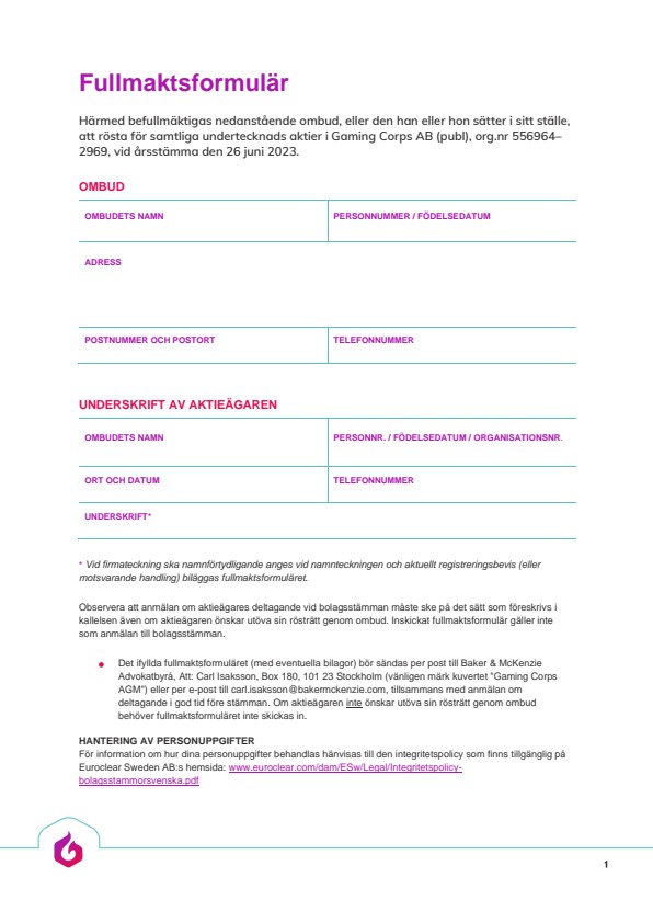 Aktieägare som skickar in förhandsröst genom ombud ska utfärda skriftlig och daterad fullmakt för ombudet. Om fullmakten utfärdats av juridisk person ska bestyrkt kopia av registreringsbevis, eller motsvarande behörighetshandling, utvisande att de personer som har undertecknat fullmakten är behöriga firmatecknare för den juridiska personen, bifogas fullmakten. Fullmakten får inte vara äldre än ett år gammal, dock att fullmakten får vara äldre än ett år om det framgår att den är giltig för en längre period, längst fem år. En kopia av fullmakten samt eventuellt registreringsbevis bör ha kommit Bolaget tillhanda genom att insändas till Bolaget på adress enligt ovan senast den 19 juni 2023. Fullmaktsformulär kommer finnas tillgängligt via Bolagets hemsida, www.gamingcorps.com, samt skickas utan kostnad till de aktieägare som begär det och uppger sin postadress.
