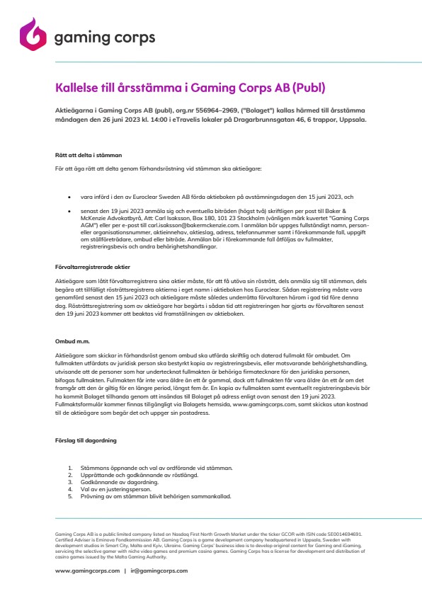 Aktieägarna i Gaming Corps AB (publ), org.nr 556964–2969, (“Bolaget”) kallas härmed till årsstämma måndagen den 26 juni 2023 kl. 14:00 i eTravelis lokaler på Dragarbrunnsgatan 46, 6 trappor, Uppsala.
