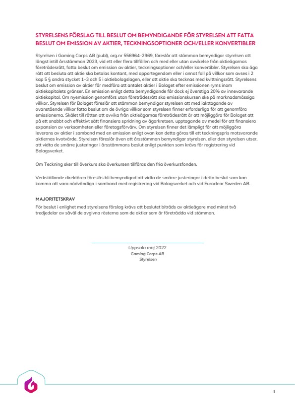 Årsredovisning och revisionsberättelse, styrelsens fullständiga förslag till beslut samt övriga handlingar enligt aktiebolagslagen kommer att finnas tillgängliga på bolagets webbplats (www.gamingcorps.com) senast från och med den 7 juni 2022. Handlingarna skickas också utan kostnad till de aktieägare som begär det och som uppger sin postadress. Handlingarna kommer även att finnas tillgängliga vid årsstämman.