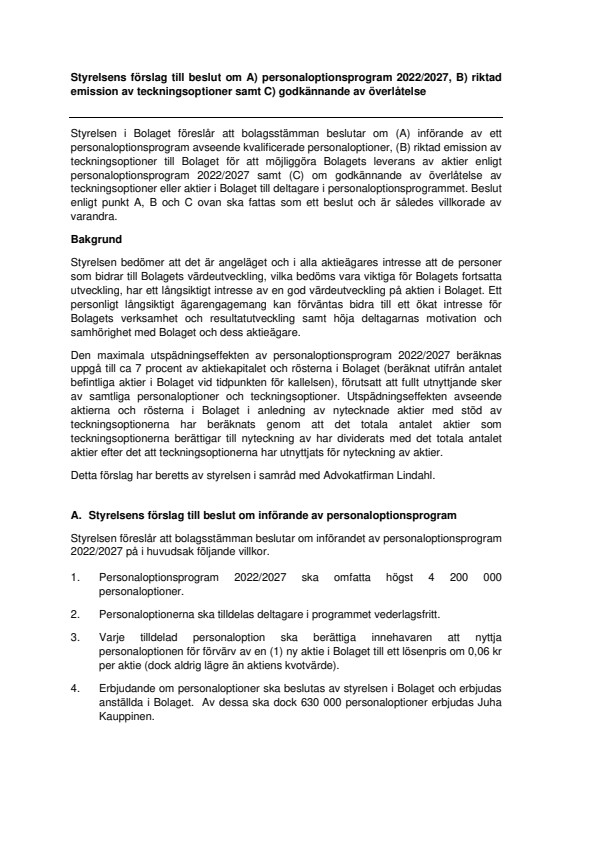 4. Erbjudande om personaloptioner ska beslutas av styrelsen i Bolaget och erbjudas anställda i Bolaget. Av dessa ska dock 630 000 personaloptioner erbjudas Juha Kauppinen.