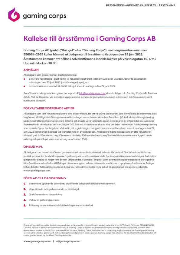 Gaming Corps AB (publ) (“Bolaget” eller “Gaming Corps”), med organisationsnummer 556964–2969 kallar härmed aktieägarna till årsstämma tisdagen den 28 juni 2022. Årsstämman kommer att hållas i Advokatfirman Lindahls lokaler på Vaksalagatan 10, 4 tr. i Uppsala klockan 10.00.