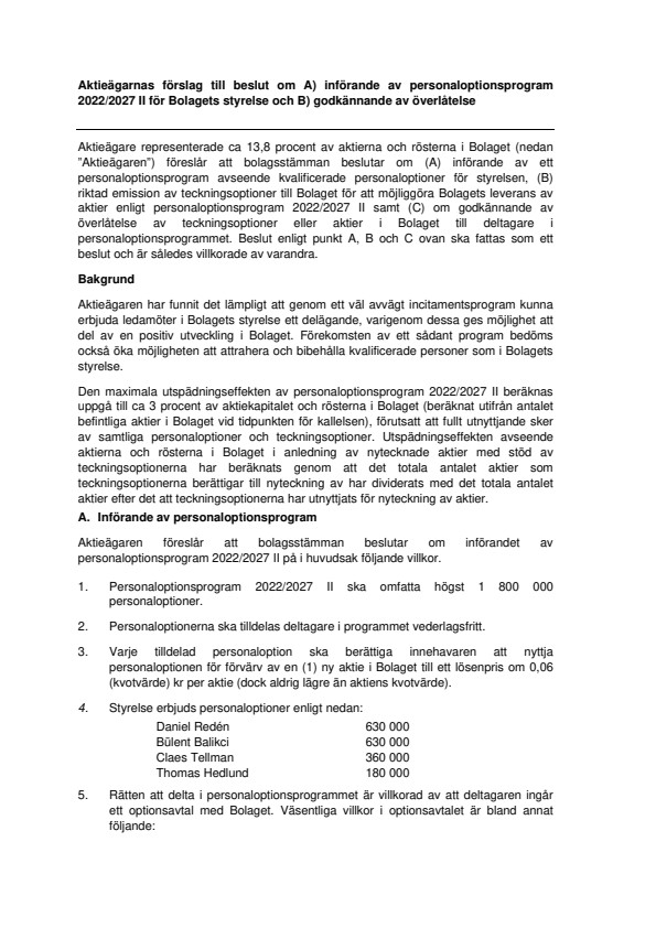 Aktieägare representerade ca 13,8 procent av aktierna och rösterna i Bolaget (nedan ”Aktieägaren”) föreslår att bolagsstämman beslutar om (A) införande av ett personaloptionsprogram avseende kvalificerade personaloptioner för styrelsen, (B) riktad emission av teckningsoptioner till Bolaget för att möjliggöra Bolagets leverans av aktier enligt personaloptionsprogram 2022/2027 II samt (C) om godkännande av överlåtelse av teckningsoptioner eller aktier i Bolaget till deltagare i personaloptionsprogrammet. Beslut enligt punkt A, B och C ovan ska fattas som ett beslut och är således villkorade av varandra.