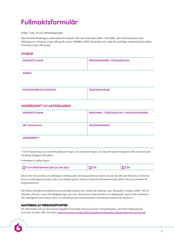 Aktieägare som avser att närvara genom ombud ska utfärda daterad fullmakt för ombud. Om fullmakt utfärdas av juridisk person ska bestyrkt kopia av registreringsbevis eller motsvarande för den juridiska personen bifogas. Fullmakts giltighet får anges till högst fem år från utfärdandet. Fullmakt i original samt eventuellt registreringsbevis bör i god tid före årsstämman insändas till Bolaget på ovan angiven adress alternativt medtas och uppvisas på stämman. Bolaget tillhandahåller fullmaktsformulär på begäran. Fullmaktsformulär finns också tillgängligt på Bolagets webbplats, www.gamingcorps.com.