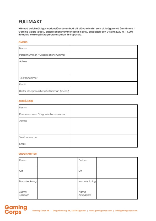 ii) dels skriftligen ha anmält sitt deltagande till Bolaget senast torsdagen den 18 juni 2020. Anmälan sker genom e-post till info@gamingcorps.com Anmälan ska innehålla namn, adress, telefonnummer, personnummer och registrerat aktieinnehav. Önskar en aktieägare medföra biträde till bolagsstämman ska detta framgå i anmälan. En aktieägare får ha med sig högst två (2) biträden. I det fall deltagande sker med stöd av fullmakt ska ombudet vid bolagsstämman visa upp en skriftlig fullmakt i original som är daterad och undertecknad av aktieägaren. Fullmakten får inte vara äldre än ett år gammal, dock att fullmakten får vara äldre än ett år om det framgår att den är giltig för en längre period, längst fem år Fullmaktsformulär finns på Bolagets hemsida samt kan efterfrågas via e-post. Kan originalhandling inte visas upp ska en bestyrkt kopia visas upp. Vid bolagsstämman ska företrädare för en juridisk person medta och visa upp ett registreringsbevis i original som inte är äldre än sex (6) månader. Kan originalhandlingen inte medtagas ska en bestyrkt kopia visas upp. Kopia av fullmakt och registreringsbevis bör i god tid före stämman insändas per post till info@gamingcorps.com och bör, för att underlätta inpasseringen vid stämman, ha kommit Bolaget tillhanda senast den 18 juni 2020.