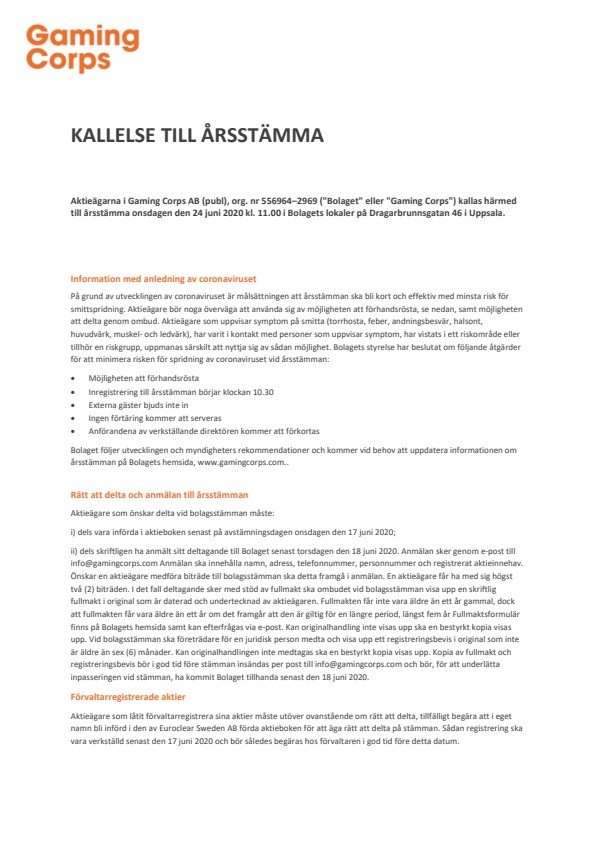 Aktieägarna i Gaming Corps AB (publ), org. nr 556964–2969 (“Bolaget” eller “Gaming Corps”) kallas härmed till årsstämma onsdagen den 24 juni 2020 kl. 11.00 i Bolagets lokaler på Dragarbrunnsgatan 46 i Uppsala.