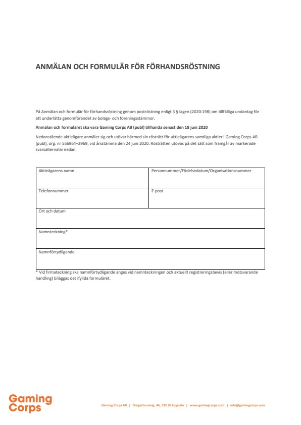 För förhandsröstning ska ett särskilt formulär användas. Formuläret finns tillgängligt på www.gamingcorps.com. En aktieägare som utövar sin rösträtt genom förhandsröstning behöver inte särskilt anmäla sig till stämman. Förhandsröstningsformuläret gäller som anmälan.