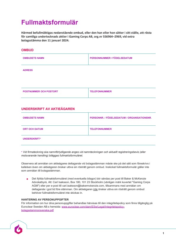 Aktieägare som företräds genom ombud ska utfärda skriftlig och daterad fullmakt för ombudet. Om fullmakten utfärdats av juridisk person ska bestyrkt kopia av registreringsbevis, eller motsvarande behörighetshandling, utvisande att de personer som har undertecknat fullmakten är behöriga firmatecknare för den juridiska personen, bifogas fullmakten. Fullmakten får inte vara äldre än ett år gammal, dock att fullmakten får vara äldre än ett år om det framgår att den är giltig för en längre period, längst fem år. En kopia av fullmakten samt eventuellt registreringsbevis bör, för att underlätta inpasseringen vid stämman, ha kommit Bolaget tillhanda genom att insändas till Bolaget på adress enligt ovan senast den 4 januari 2024. Fullmakten i original samt registreringsbevis ska även uppvisas på stämman. Även fullmaktsintyg accepteras. Fullmaktsformulär kommer finnas tillgängligt via Bolagets hemsida, www.gamingcorps.com, samt skickas utan kostnad till de aktieägare som begär det och uppger sin postadress.