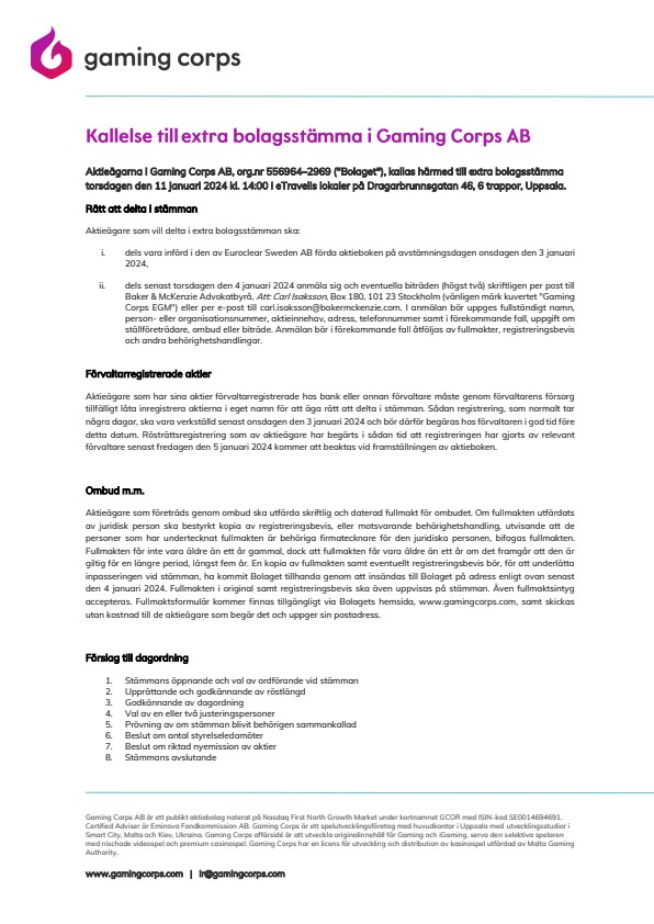Aktieägarna i Gaming Corps AB, org.nr 556964–2969 (“Bolaget”), kallas härmed till extra bolagsstämma torsdagen den 11 januari 2024 kl. 14:00 i eTravelis lokaler på Dragarbrunnsgatan 46, 6 trappor, Uppsala.