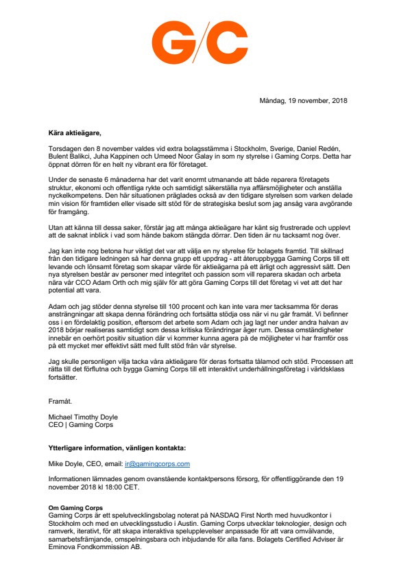 Jag kan inte nog betona hur viktigt det var att välja en ny styrelse för bolagets framtid. Till skillnad från den tidigare ledningen så har denna grupp ett uppdrag – att återuppbygga Gaming Corps till ett levande och lönsamt företag som skapar värde för aktieägarna på ett ärligt och aggressivt sätt. Den nya styrelsen består av personer med integritet och passion som vill reparera skadan och arbeta nära vår CCO Adam Orth och mig själv för att göra Gaming Corps till det företag vi vet att det har potential att vara.
