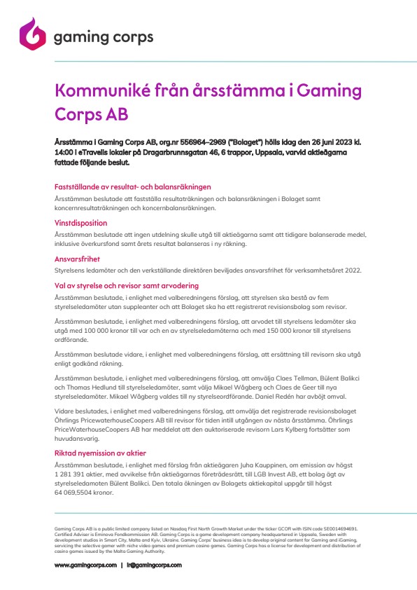 Årsstämma i Gaming Corps AB, org.nr 556964–2969 (”Bolaget”) hölls idag den 26 juni 2023 kl. 14:00 i eTravelis lokaler på Dragarbrunnsgatan 46, 6 trappor, Uppsala, varvid aktieägarna fattade följande beslut.