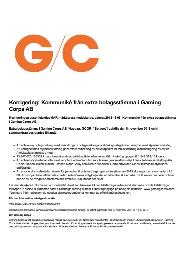 Korrigeringen avser felaktigt MAR-märkt pressmeddelande, daterat 2018-11-08: Kommuniké från extra bolagsstämma i Gaming Corps AB.