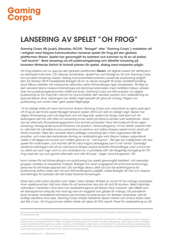 Gaming Corps AB (publ) (Nasdaq: GCOR, ”Bolaget” eller ”Gaming Corps”) meddelar att i enlighet med tidigare kommunikation lanseras spelet Oh Frog på den globala plattformen Steam. Spelet har genomgått tre betatest och kommer nu få en så kallad ”soft launch”. Bred lansering via ett publiceringsbolag och därefter lansering på konsolen Nintendo Switch är fortsatt planen för spelet, dialog med motparter pågår.