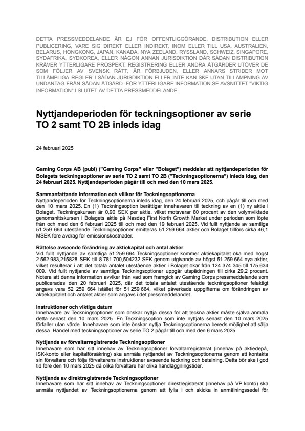 Gaming Corps AB (publ) (”Gaming Corps” eller ”Bolaget”) meddelar att nyttjandeperioden för Bolagets teckningsoptioner av serie TO 2 samt TO 2B (”Teckningsoptionerna”) inleds idag, den 24 februari 2025. Nyttjandeperioden pågår till och med den 10 mars 2025.