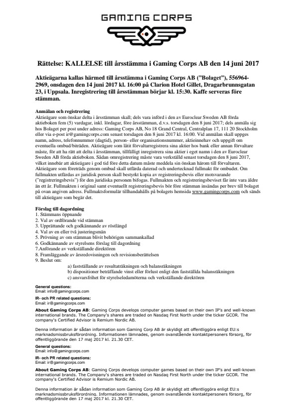Aktieägarna kallas härmed till årsstämma i Gaming Corps AB (“Bolaget”), 556964- 2969, onsdagen den 14 juni 2017 kl. 16:00 på Clarion Hotel Gillet, Dragarbrunnsgatan 23, i Uppsala. Inregistrering till årsstämman börjar kl. 15:30. Kaffe serveras före stämman.