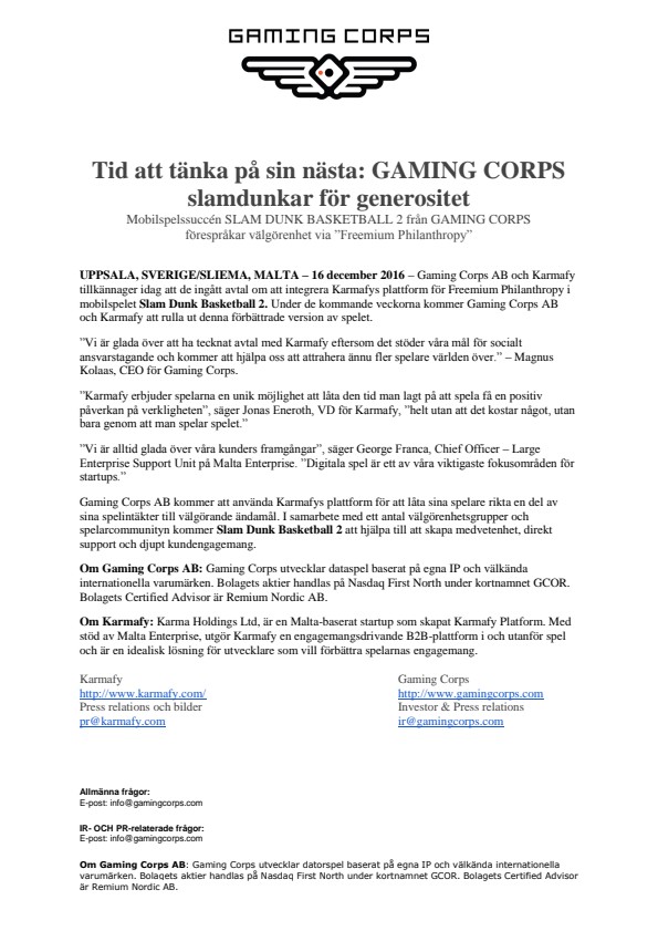 UPPSALA, SVERIGE/SLIEMA, MALTA – 16 december 2016 – Gaming Corps AB och Karmafy tillkännager idag att de ingått avtal om att integrera Karmafys plattform för Freemium Philanthropy i mobilspelet Slam Dunk Basketball 2. Under de kommande veckorna kommer Gaming Corps AB och Karmafy att rulla ut denna förbättrade version av spelet.