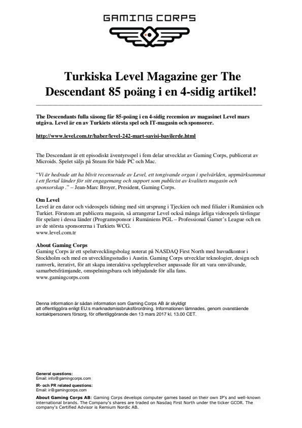 “Vi är hedrade att ha blivit recenserade av Level, ett tongivande organ i spelvärlden, uppmärksammat i ett flertal länder för sitt engagemang och support som publicist av kvalitets magasin och sponsorskap .” – Jean-Marc Broyer, President, Gaming Corps.