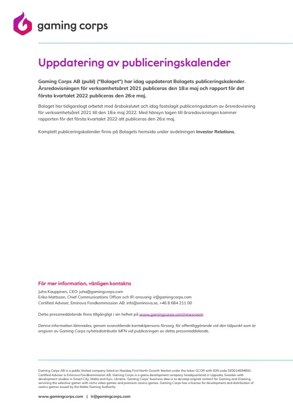 Gaming Corps AB (publ) (“Bolaget”) har idag uppdaterat Bolagets publiceringskalender. Årsredovisningen för verksamhetsåret 2021 publiceras den 18:e maj och rapport för det första kvartalet 2022 publiceras den 26:e maj.